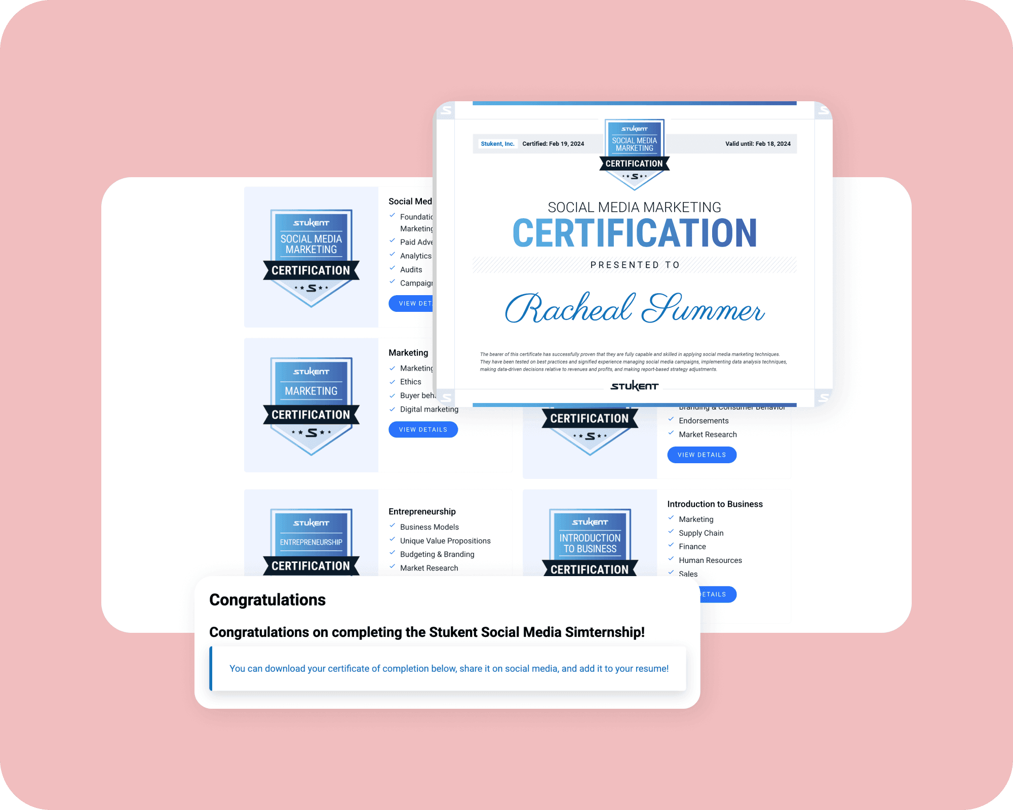 Stukent CTE Certifications provide students with credentials that demonstrate proficiency, boost employability, and prepare them for future careers.