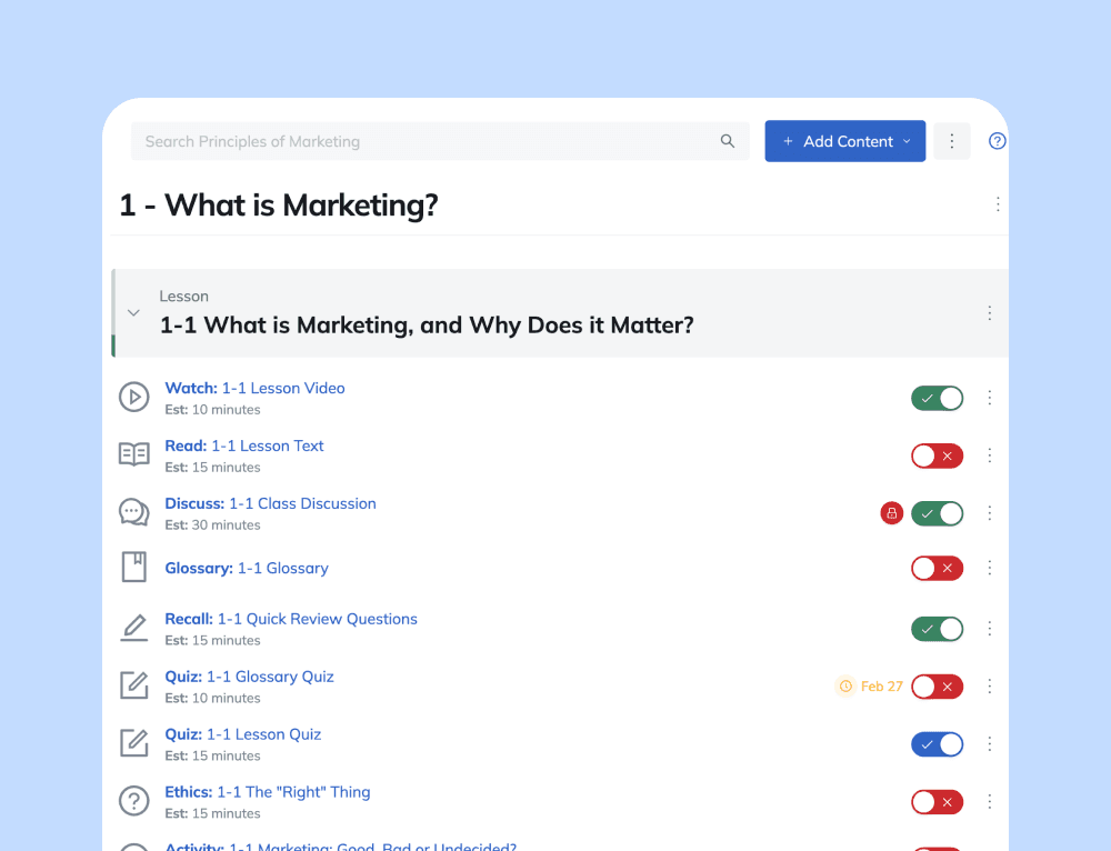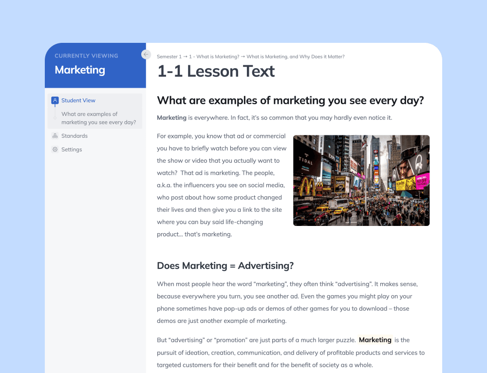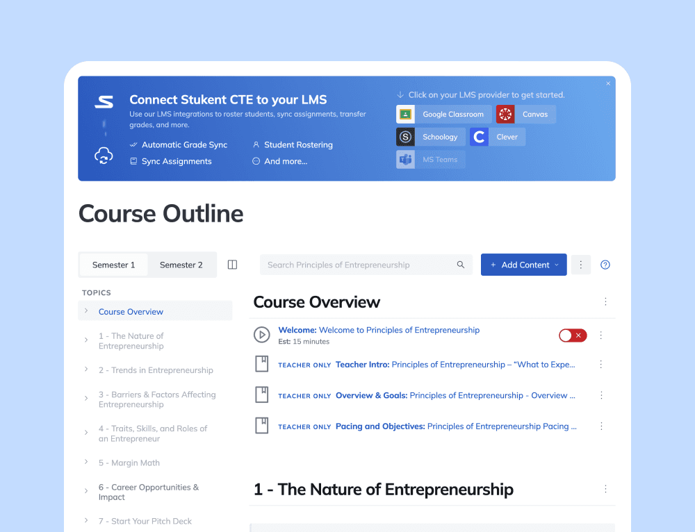 Stukent's CTE platform makes teaching easy and impactful. Each lesson includes everything you need, including full-text content, dynamic videos, auto-graded assessments, and more. With real-time reporting, built-in standards alignment, and LMS integration, it's ready to go right out of the box.