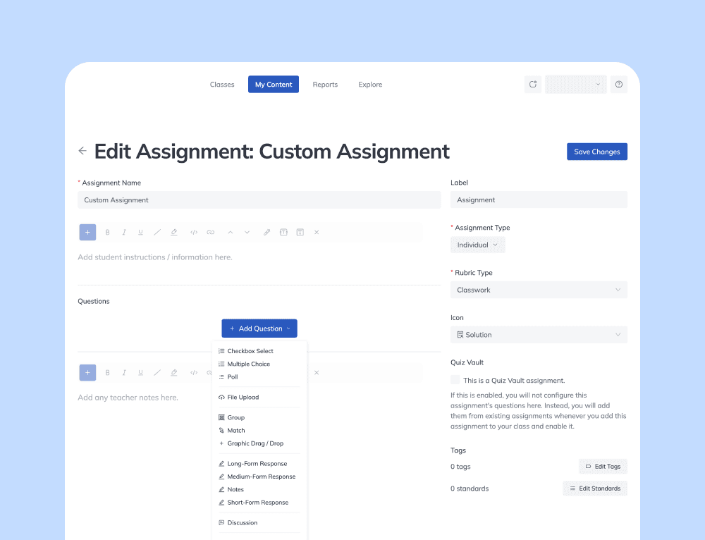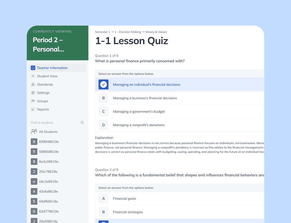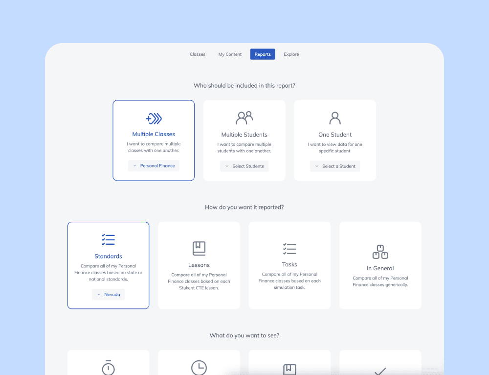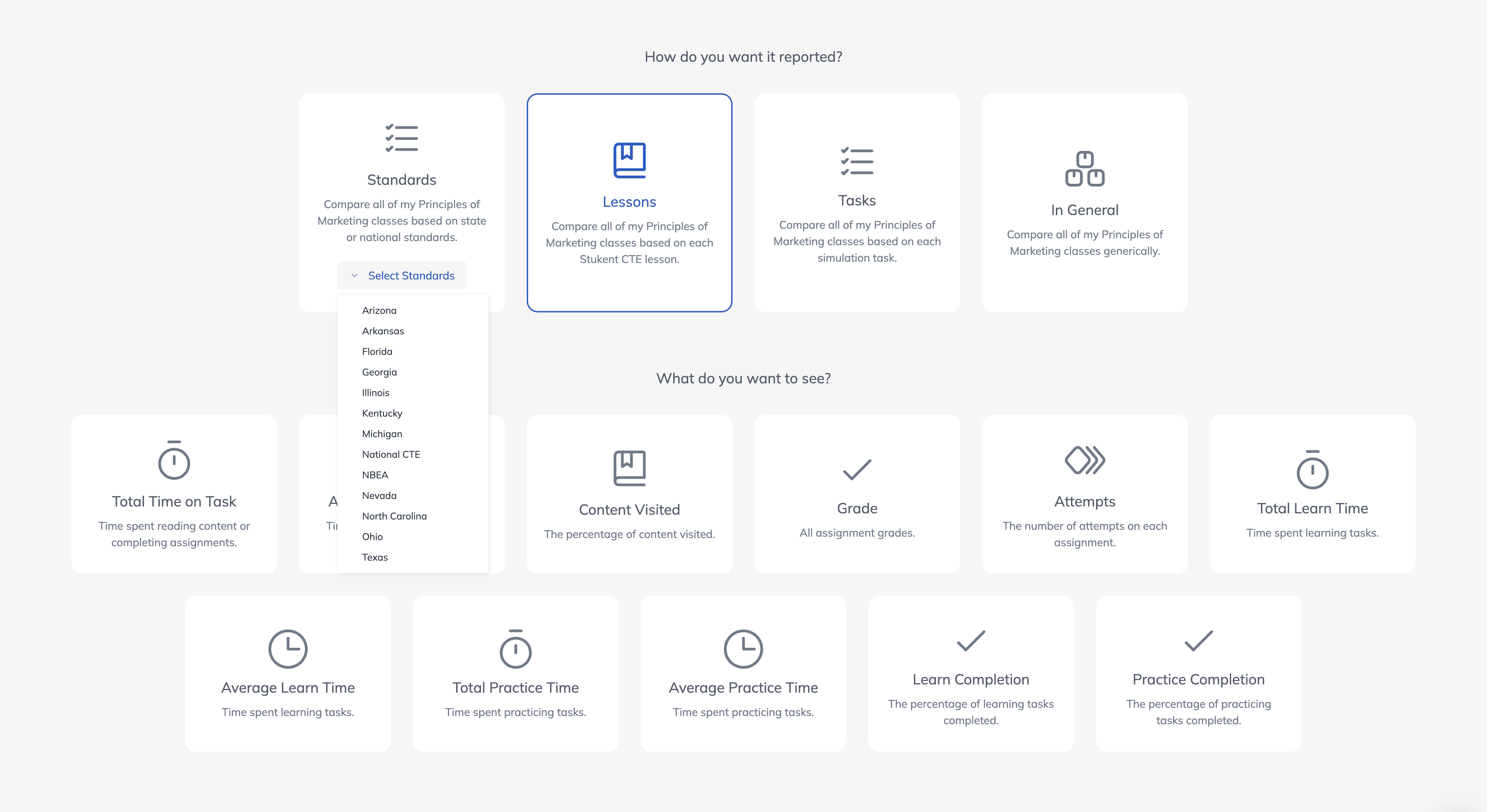 Stukent CTE’s teacher dashboard reports in real time, showing you how long students spend on content, how they’re performing on assessments, and how each class or individual stacks up to your state’s standards.