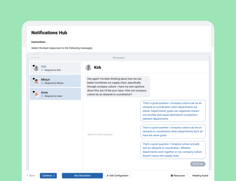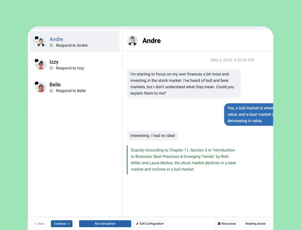With a Simternship, students can see the professional applications of their coursework from the first day of class. Students receive immediate feedback on their work, helping to correct misconceptions before they are encoded into long-term memory.